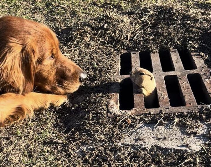 隙間から出てくるプレーリードッグを、静かに見守る犬さん。