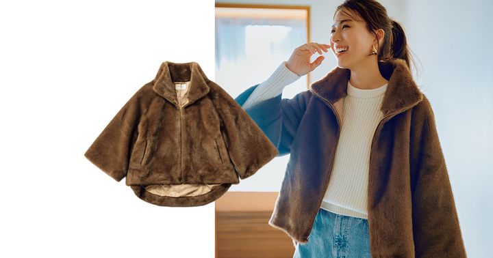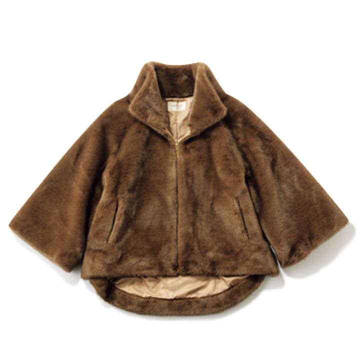 なめらかな肌触りのフェイクミンクを使用。トレンドのケープ風シルエットとお尻が隠れる着丈で着痩せ効果抜群。ジップはゴールド。