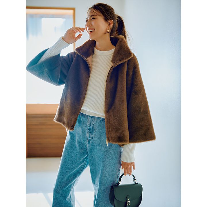 本格的な寒さが到来し、気づけば年の瀬もすぐそこ。そこで今月は、イベントが重なる年末年始に向けたオシャレ準備服をご用意しました。今回は、風合いがとてもリッチなエコファーのショートコートをピックアップ。1枚羽織れば、カジュアルコーデも華やかに。