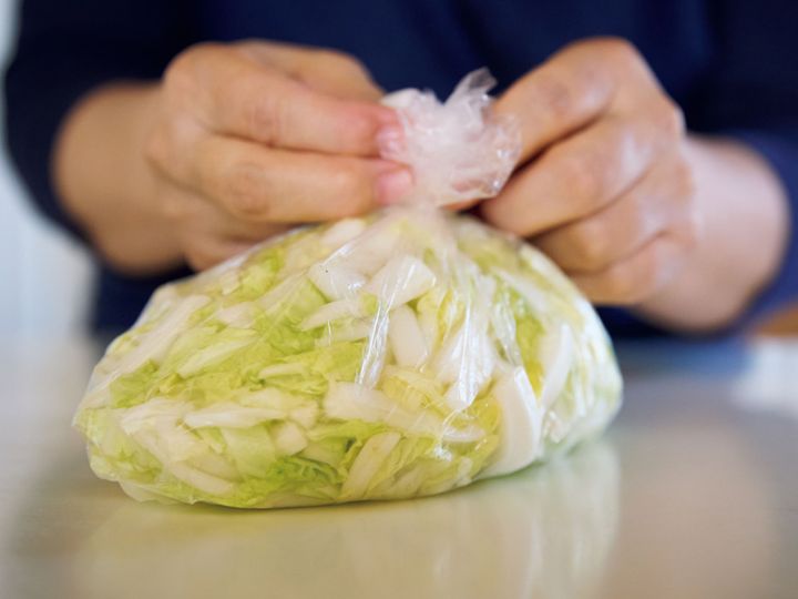 白菜は長さ5cmに切ってから、縦に幅7~8mmに切る。ポリ袋に入れ、塩を加えて空気を入れ、口を閉じながら振り混ぜる。全体に塩がいきわたったら空気を抜いて口を閉じ、冷蔵庫で保存する。30分~1時間おいてしんなりすればOK。