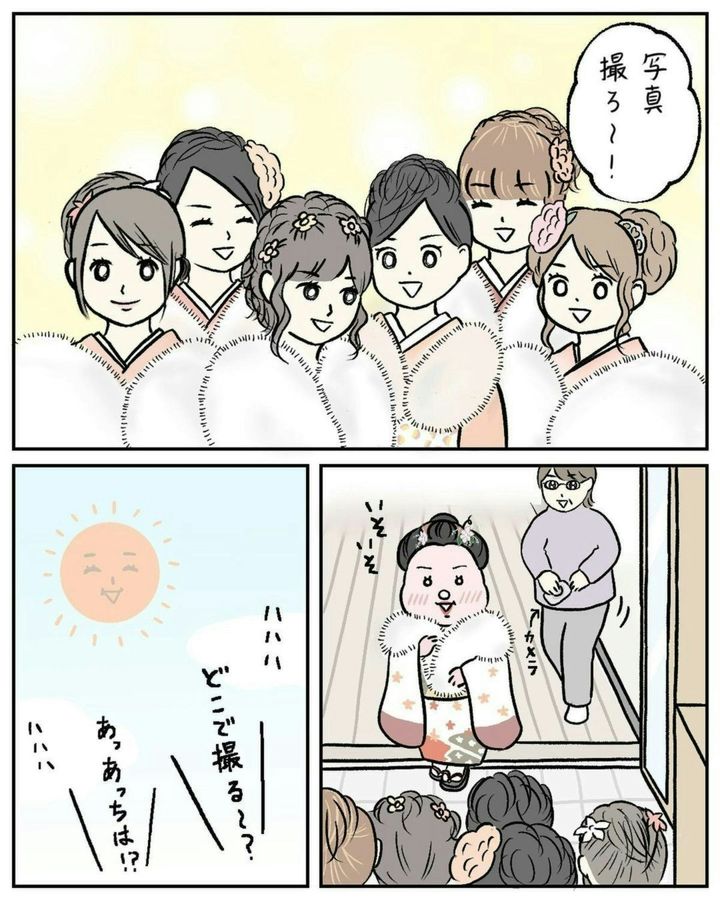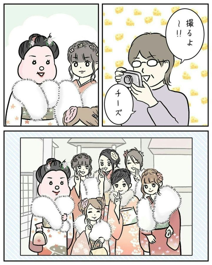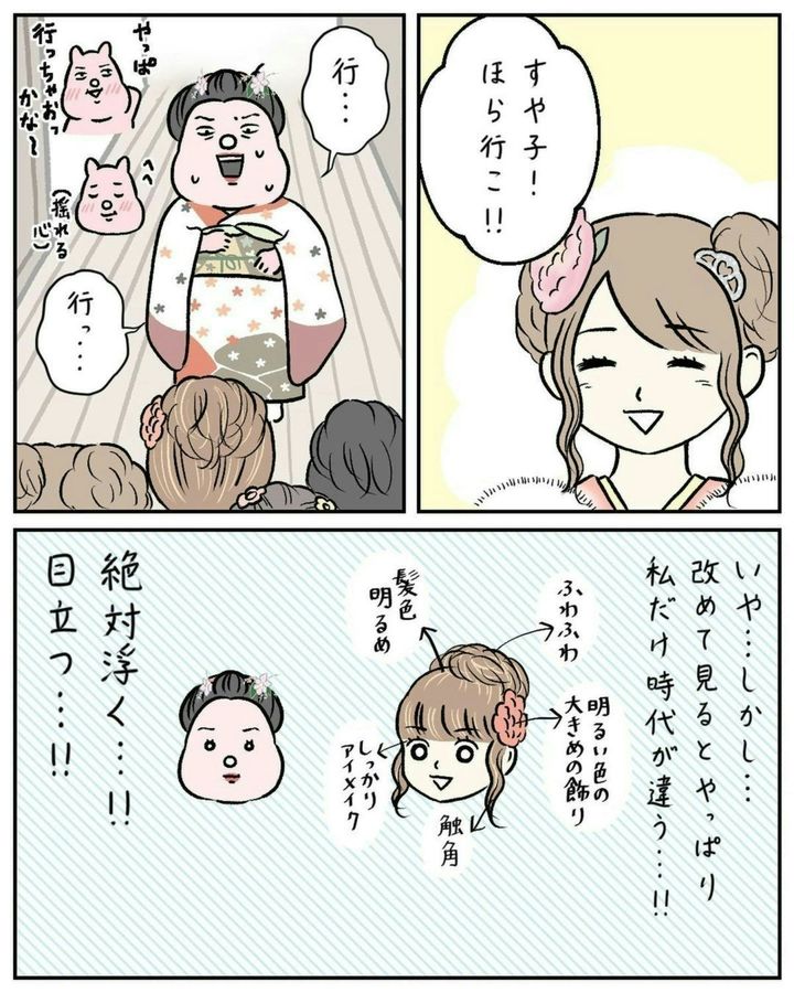 母に「15万円あげる」と提案され、昔母が着た振袖と、日本髪のヘアセットで成人式を迎えることを了承したすや子さん。ところが、実際に着付けとヘアメイクができあがると、自分だけタイムスリップしたかのような装いに…。心配した友人が迎えにきてくれましたが、友人たちと比べてしまい、ますます自信がなくなってしまいました。