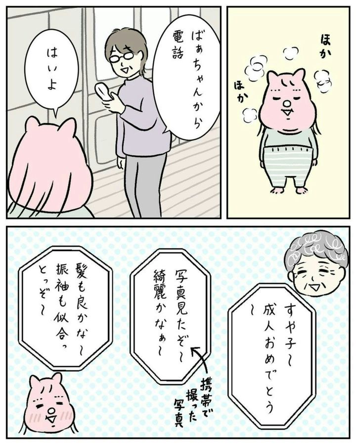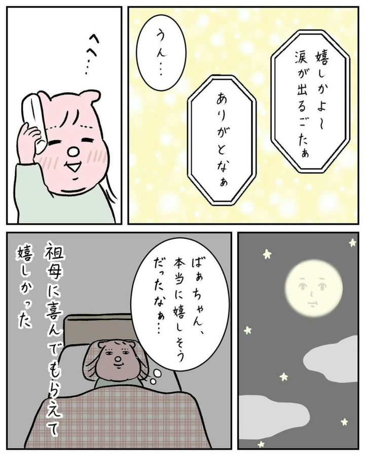 電話で祖母から「涙がでるほどうれしい」と言われた、すや子さん。ほんわかとした優しい気持ちに包まれますね。一日の締めくくりをとてもいい気分で終えることができました。