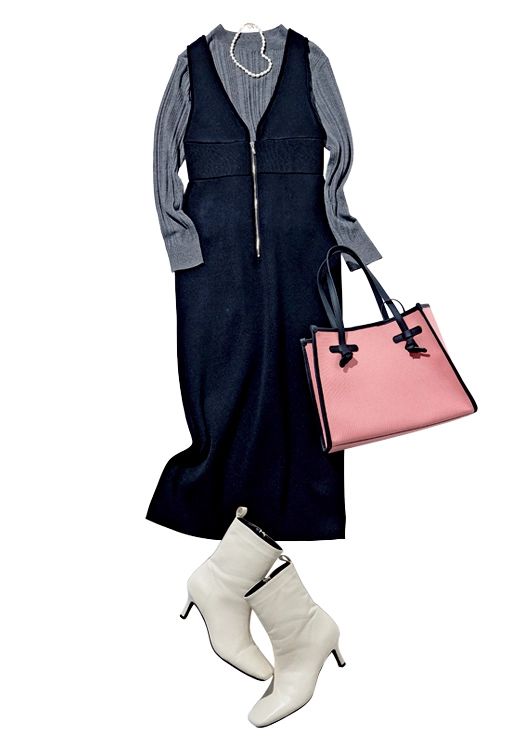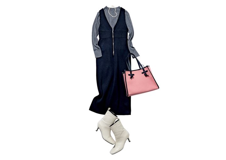 ニット¥5,489/ロペピクニック(ジュン) ジャンスカセット(ジャンスカ)¥15,994/NATURAL BEAUTY BASIC ショルダーバッグ¥37,400/ジャンニ キアリーニ(ジャンニキアリーニ 銀座店) ショートブーツ¥2,420/神戸レタス パールネックレス¥10,780/Hh(フォーティーン ショールーム)