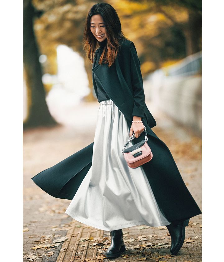 忙しい時も余裕たっぷりに見せるのは、シルバーなボリュームスカート。せわしない脚の動きすらも、ドラマチックに演出!