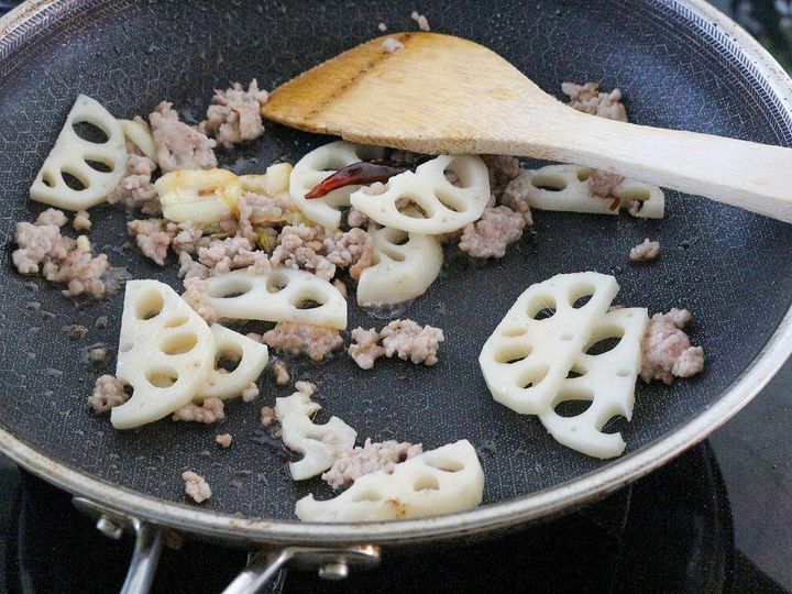 2. 1に豚ひき肉と食べやすい大きさに切ったれんこんを加え、火が通ったら塩、こしょうと酒で下味をつける。