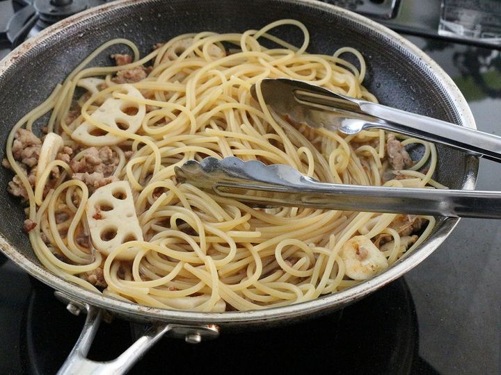 4. 2に茹でたパスタ、ゆで汁とポン酢を加え、フライパンを手早く揺すりながら水分がほとんどなくなるまで炒め合わせる。