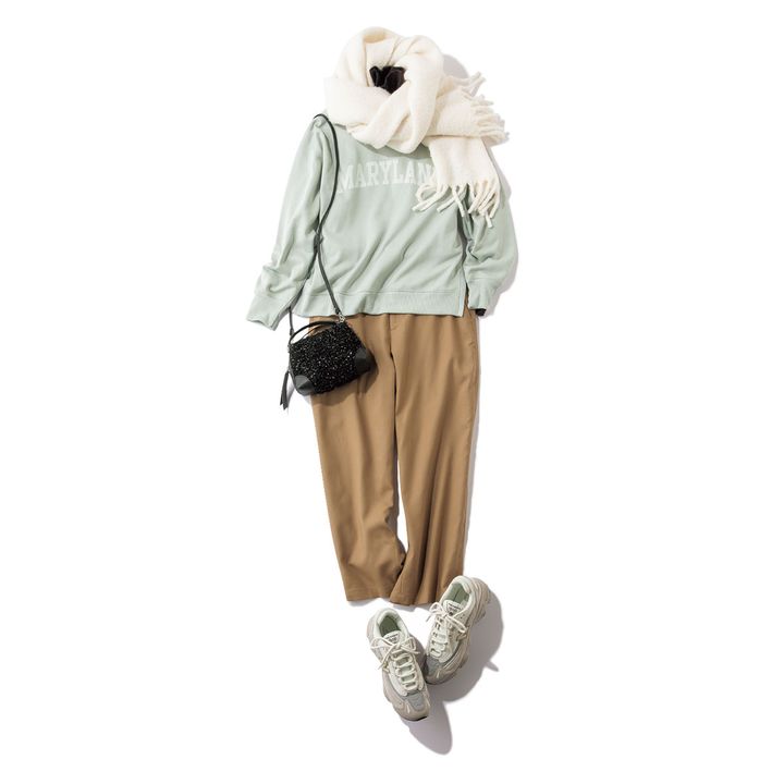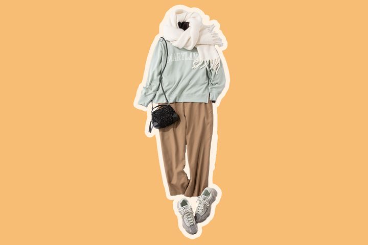 ストール¥2,990(UNIQLO)ショルダーバッグ¥46,200(ジャンニ キアリーニ/ユナイテッドアローズ 渋谷スクランブルスクエア店)スニーカー¥22,000(ニューバランス/ニューバランス ジャパンお客様相談室)