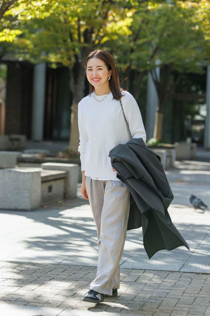 「車移動が多いので、着たままでももたつかないところが高ポイント。中に厚手のニットを着てもゴワゴワせず、ラインもキレイにキープ。シンプルなデザインがどんなコーデにも合わせやすく、重宝しています。黒ではなく、グレーなのも今年っぽくて気に入っています」林 香里さん・36歳(165cm 12歳の男の子と7歳の女の子ママ)
