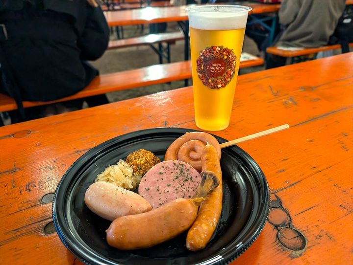 きらめくイルミネーションの下、由緒正しきいただくビールとソーセージは格別の味! オクトーバーフェストと同様、屋外で飲むビールは本当に最高です。