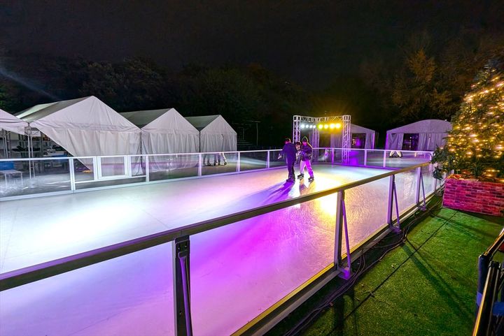 イベント会場では特別なスケートリンクが常設。このスケートリンクは氷ではなく、初心者でも比較的滑りやすい樹脂製。シューズ・ヘルメット・軍手のレンタルが行われているので、手ぶらでフラッと体験できるのがうれしいポイント!