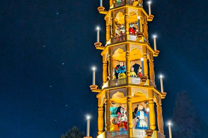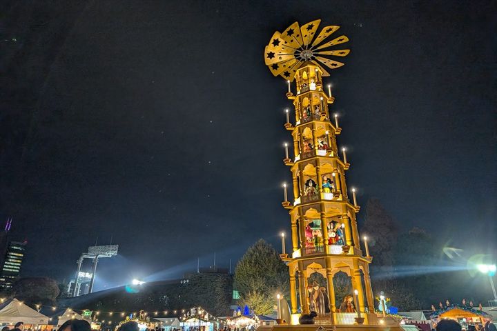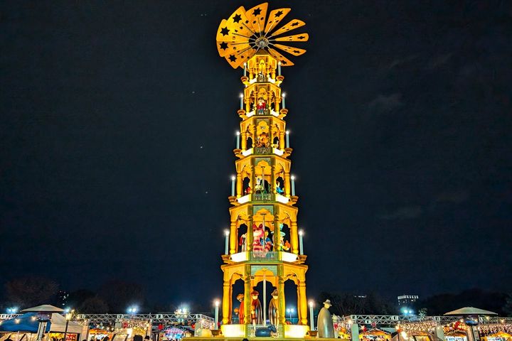 会場でそびえ立つクリスマスピラミッドは、本場ドイツ・ドレスデンで飾られるものと同じく、世界最大の高さ(14m)を誇り迫力満点!