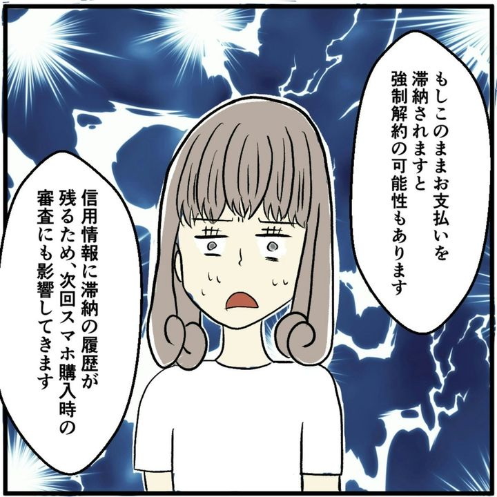 携帯ショップへと駆け込んだ風花。思っていた以上にスマホ代を滞納していたことに驚きます。そして、スマホ代をこれ以上滞納してしまうと、強制解約の可能性があると告げられます。さらに、信用情報に履歴が残ってしまうと、今後の購入にも影響が出るなんて…。厳しい現実を知り、風花は衝撃を受けます。