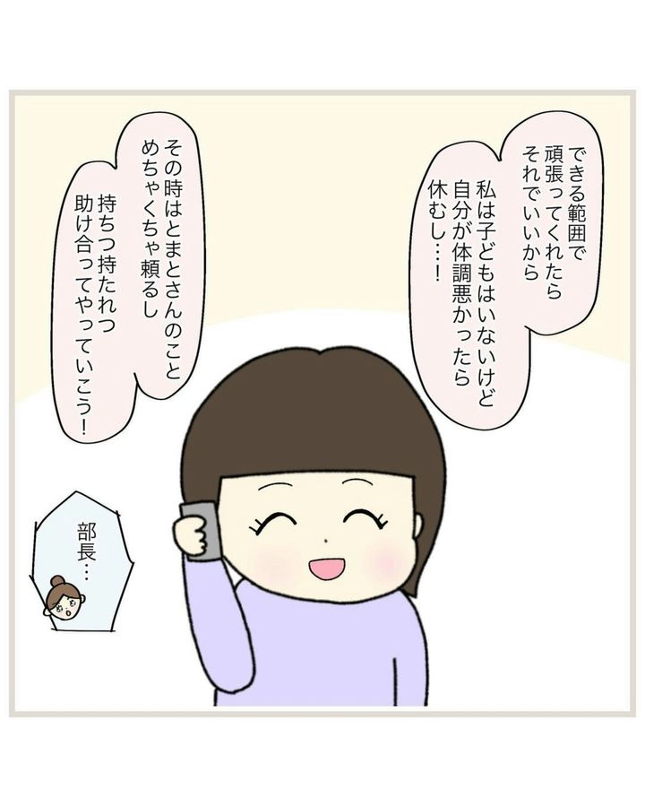 「持ちつ持たれつ助け合ってやっていこう!」と明るくやさしくフォローしてくれる部長のおかげで心がラクになったというとまとママさん。働きたくても働けない状況は、遅かれ早かれ誰しも経験することです。相手の立場に立って、思いやりのある言葉がけができたらお互いに気持ちがいいものですよね。