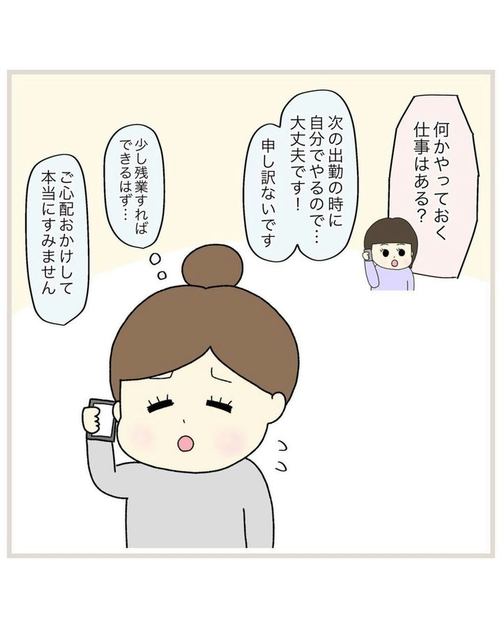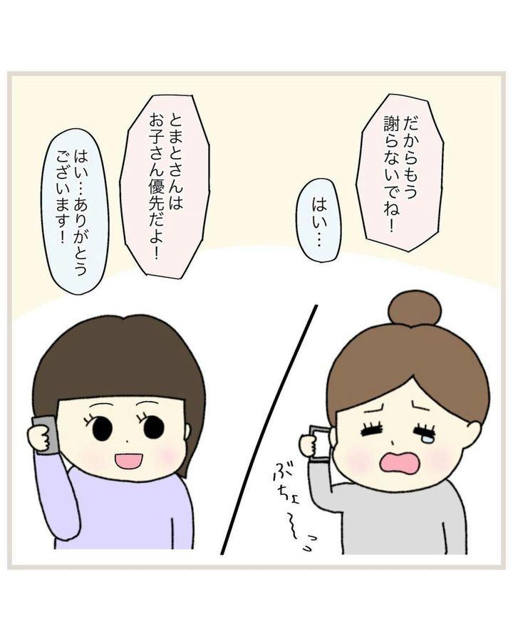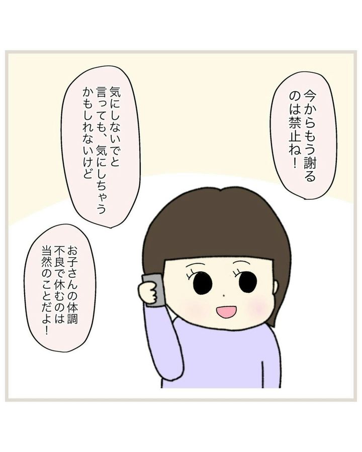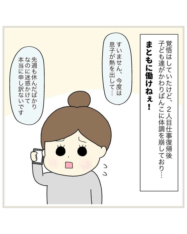 とまとママ(@tomatomama2021)さんは、2人のお子さんを育てるワーママです。子どもたちが変わりばんこに体調を崩し、仕事を休む日が続いてしまいます。電話で「申し訳ないです」と謝るとまとママさんに、「もういい加減にしてくれる?」と言い出す上司。怒られるのかと思いきや、上司がかけてくれた言葉とは…?どうぞごらんください。
