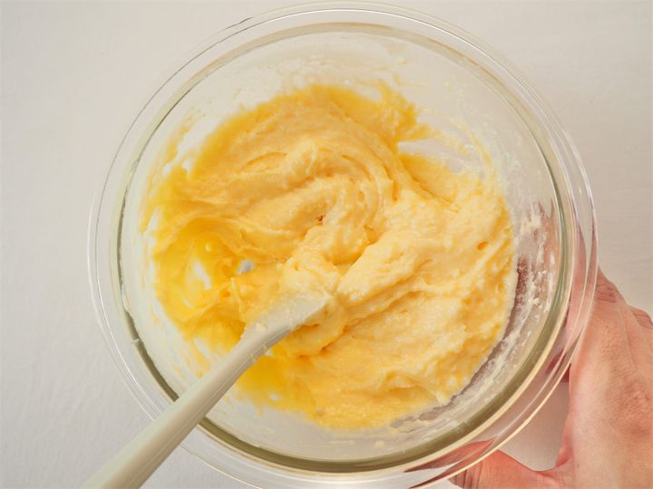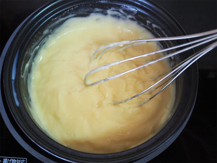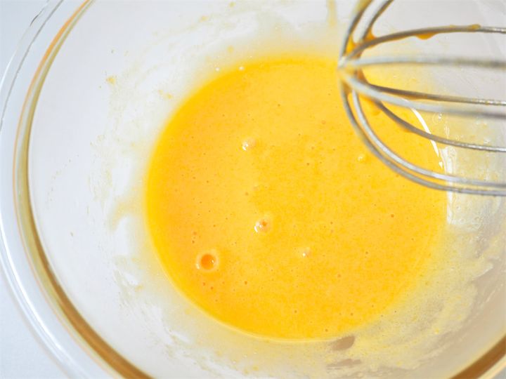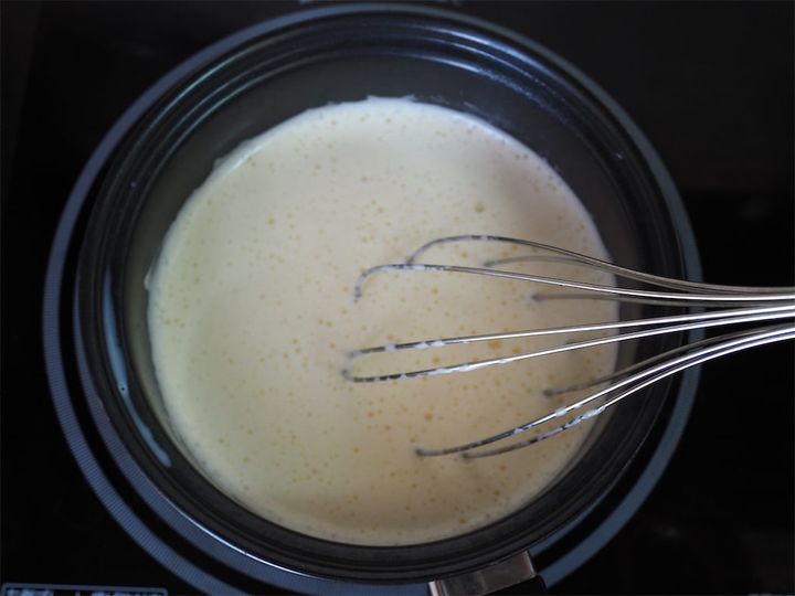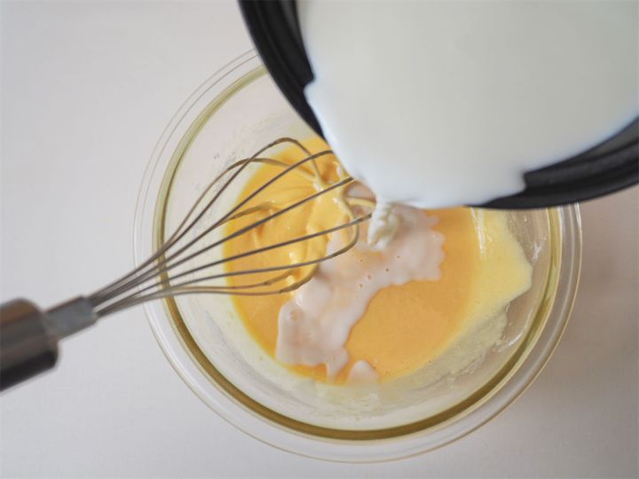 白っぽくなったら卵黄が空気を含んだ合図!卵黄が白くなるまで混ぜることで、牛乳の熱が卵に均等に広がるそう。