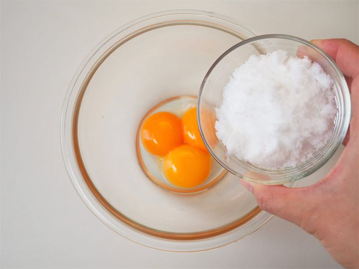 2. ボウルに卵黄、砂糖を入れ、白っぽくなるまで混ぜ合わせる。