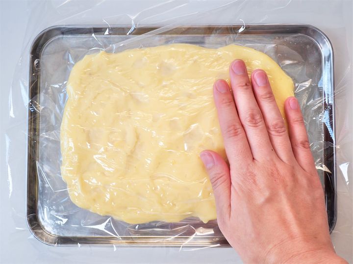 6. とろとろになったらバットに移し、ラップをし冷蔵庫で冷やす。