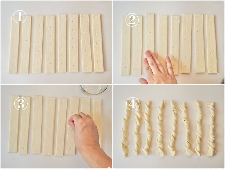 7. パイシートを8等分にカットし、表面に手で水を塗りグラニュー糖をかける。さらに、1本ずつ捻る。