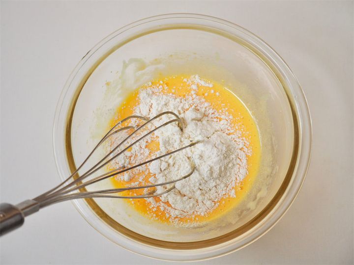 3. 2のボウルに小麦粉を加え、軽く混ぜ合わせる。