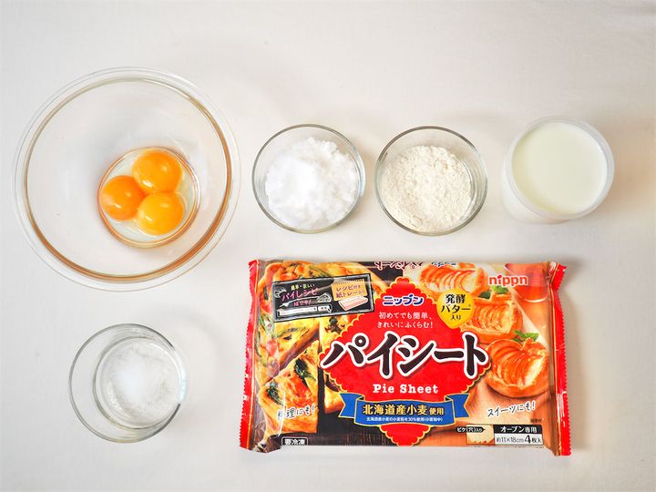 レシピの画像を見ると、幅が2cm程度あるように見えました。今回市販でよく見るパイシートを使用しましたが小さめだったため、2枚(11cm × 18cmのもの)を縦に4等分にして使用。基本的には、お好みの幅や長さでもいいかもと感じました。