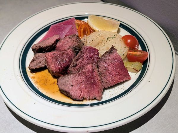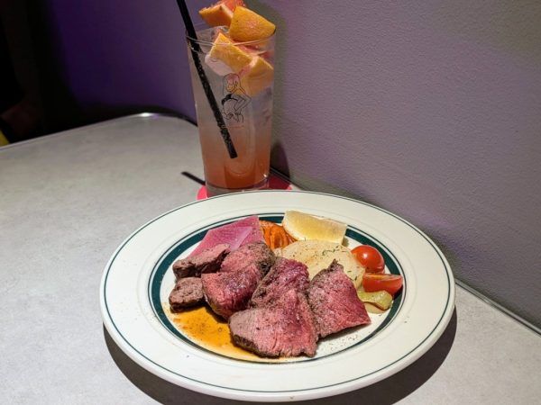 ジューシーなハラミと相性のよいブルゴーニュバターを付けて味わう「牛ハラミのステーキステーキ~ブルゴーニュバター~」(1628円)です。肉厚なハラミはボリューム感があります。ソースもおいしいです。