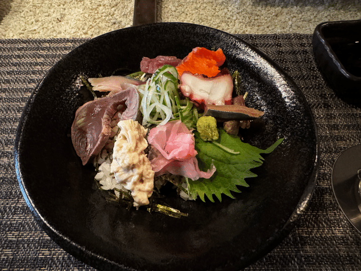 この日の海鮮丼は佐島のたこ、汲み上げ湯葉、グレープフルーツで作ったしめ鯖、本番高知で学んだカツオの藁焼き等を自家製燻製醤油でいただきました。どれもひと手間かかっているのがわかりますが カツオの藁焼きが特に感じられました。