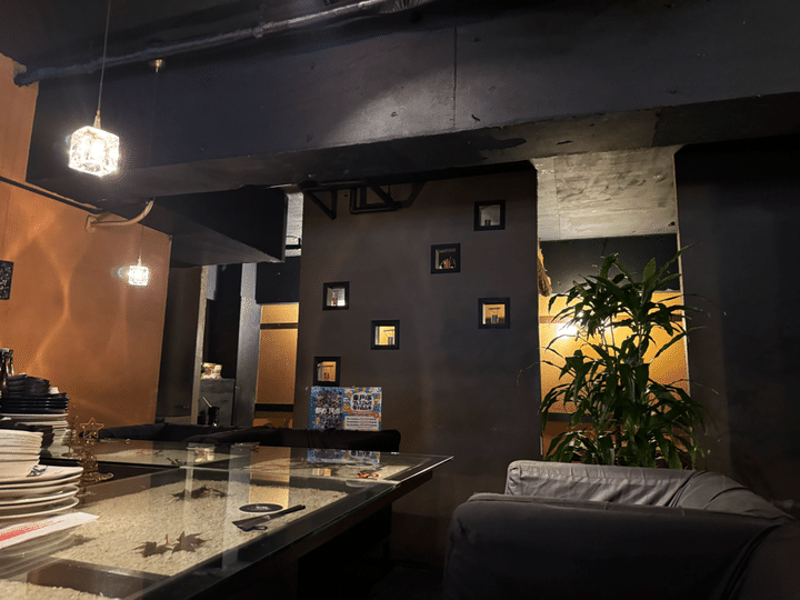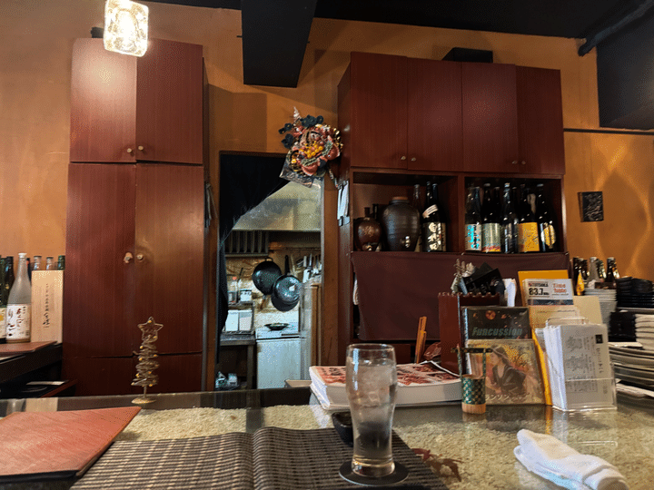 黒とブラウン系の木製家具で落ち着いた感じの店内。大きなカウンターと大きな椅子。とってもゆったりした感じでお料理を注文です。