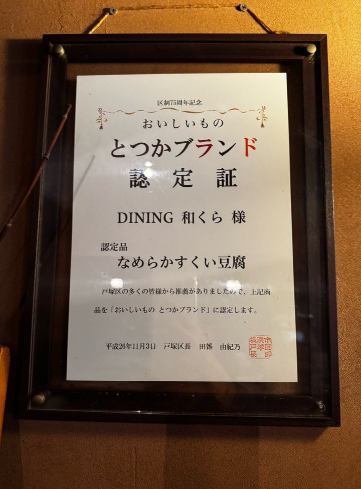メニューに戸塚ブランド認定豆富ってあります。平成26年から戸塚区のおいしいものを区民の方からの推薦で認定しているおいしいものが戸塚ブランドとの事。(※令和5年12月で認定期間終了)