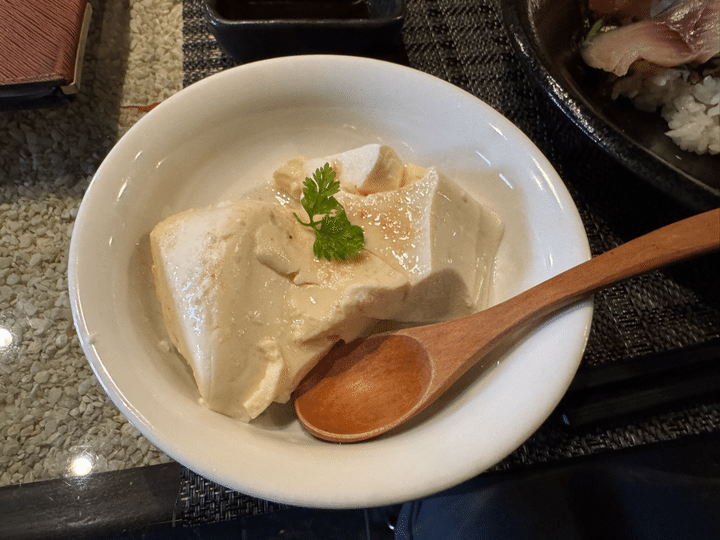 それに認定されたお豆富です。お豆富にオリーブオイルと岩塩がかかっています。大豆の香りと甘みを感じられるお豆富です。