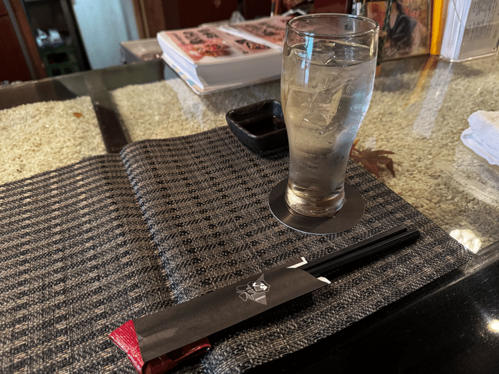 椅子に座って一番に出てきたもの。お冷です。「今日のお冷は来宮神社のお水です」飲食店でお水取りの水が出てきたのは初めてです。オーナー様が前日に汲みに行ったとのこと。しかも来宮神社。伊豆出身の私にはうれしいお水です。