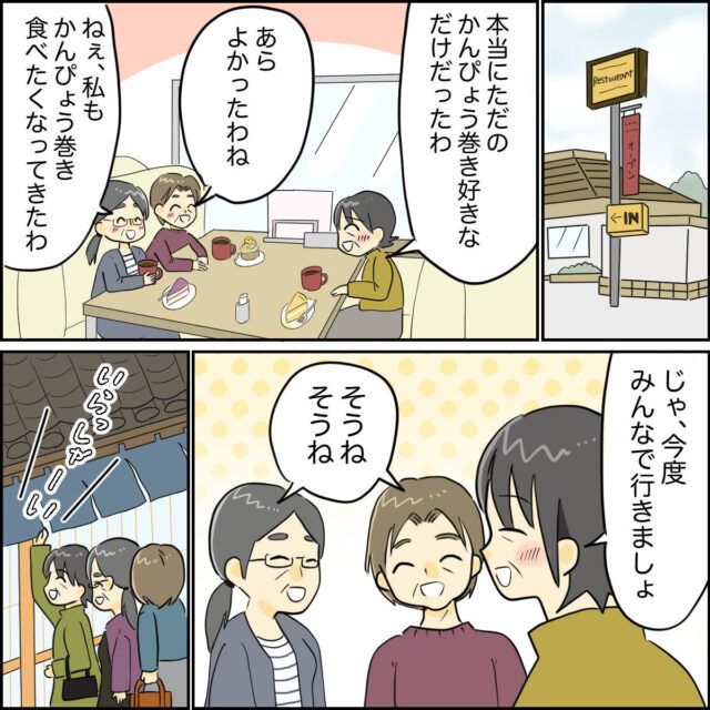 そしてまた別の日。久しぶりにファミリーレストランに集合した友人達に、「本当にただのかんぴょう巻き好きなだけだったわ」義母が報告すると、「あら、よかったわね」と答える友人、するともう1人が「ねぇ、私もかんぴょう巻き食べたくなってきたわ」と言い出しました。「じゃ、今度みんなでいきましょ」義母が言い、「そうねそうね」と談賛成する友人達、その後、義母は仲良し3人組でかんぴょう巻きを食べに行ったのでした。