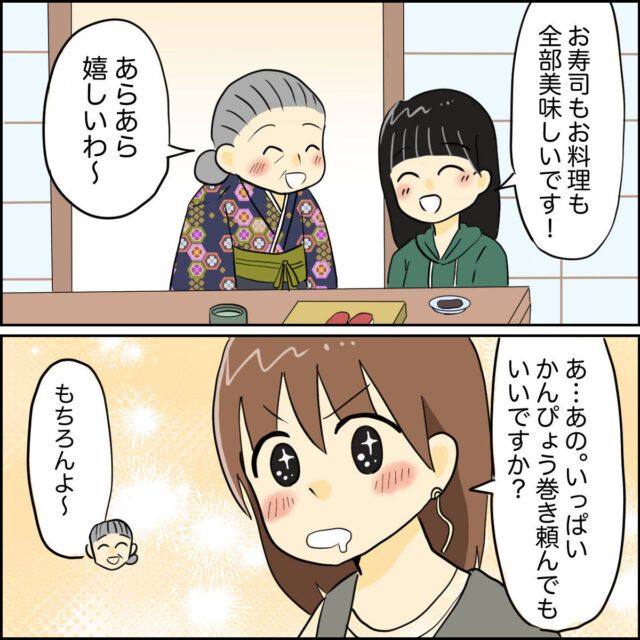このお寿司屋さんのかんぴょう巻きを大絶賛するミホさん、すると女将さんが近くにやって来て「そんなに気に入ってくれたの?うれしいわ~」と笑顔で言いました。2人のやり取りを見ていた義母はきょとん。すると、女将さんに「昔から『かんぴょう巻きのうまい店は名店の証』と言われていて大将が喜んでるの」と嬉しそうに言われたのでした。