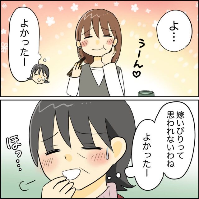 たくさんのかんぴょう巻きを前に大満足なミホさん。その姿を見た義母は「よ・・よかったー」とホッと胸を撫でおろしました。そう、義母は「これで嫁いびりって思われないわね」と思ってホッとしていたのでした。