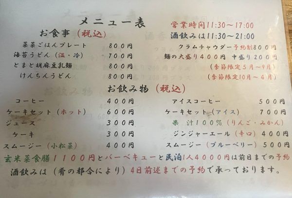 お食事はごはんプレートの他、海苔うどんやけんちんうどんがあります。 ケーキセットや小松菜スムージー、果汁100%ジュースも。