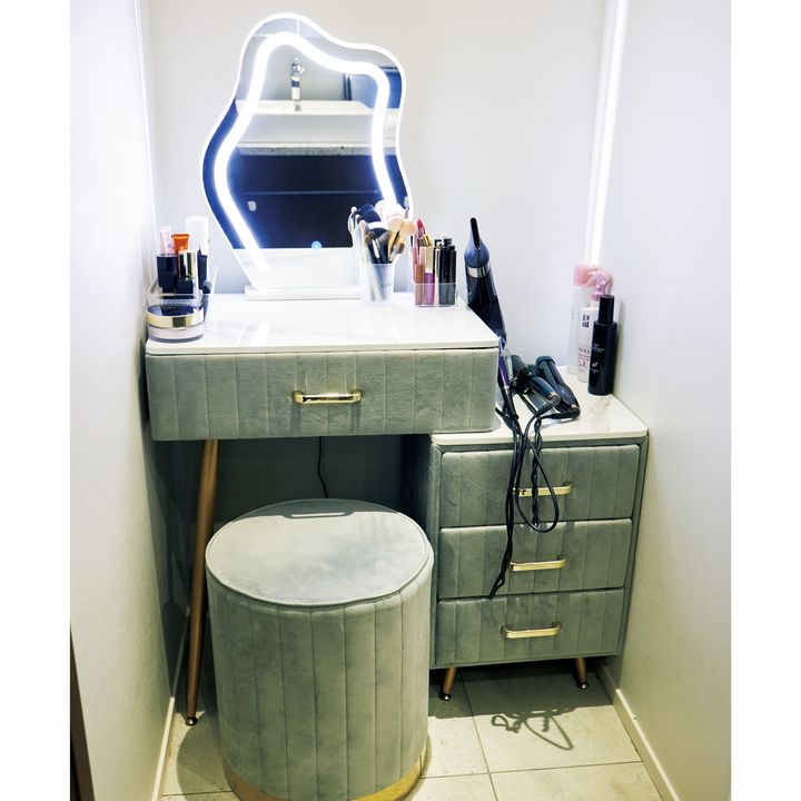 高級感のあるベロア素材のドレッサーをリフォーム時にオーダー。見た目より収納力高めで大量のコスメもしっかり収まります。