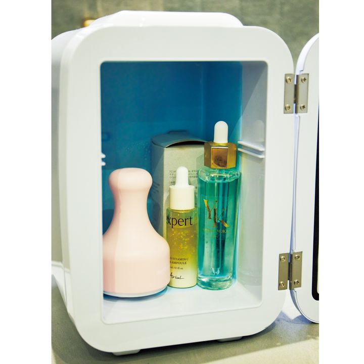 要冷蔵のYUNAŚ CHOICEの幹細胞美容液などはコスメ用のミニ冷蔵庫に入れて保存。ドレッサーの下にあるのでキッチンに行く必要がなくて便利です。