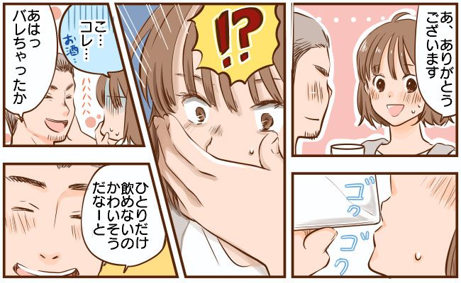 酔った夫の友人は「いやーかわいいっすね!」と子どもたちに言い、「どうぞ」とコップを渡してくれました。それを受け取りゴクンと飲むと、味に違和感が……! ゲホゲホッと咳込み、すぐにそれがお酒だとわかりました。