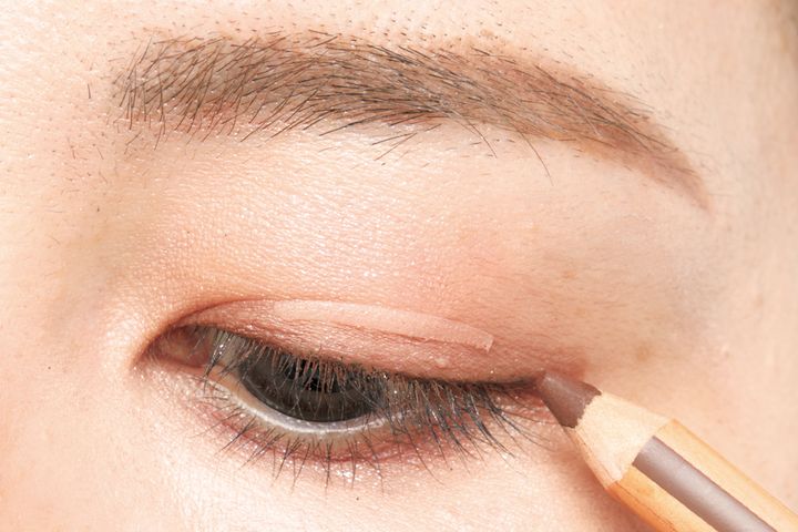 まつ毛の間を埋めるように、Eの明るめブラウンのアイライナーを引く。目頭から目尻までしっかり入れて、たるんで隠れてきた目の輪郭を掘り起こすようなイメージで。