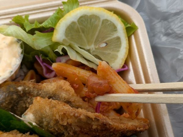 フィッシュフライに良く合う、大豆入りチリソースのペンネや、栄養たっぷりの十八穀米など、味や栄養のバランスもバッチリのお弁当でした。
