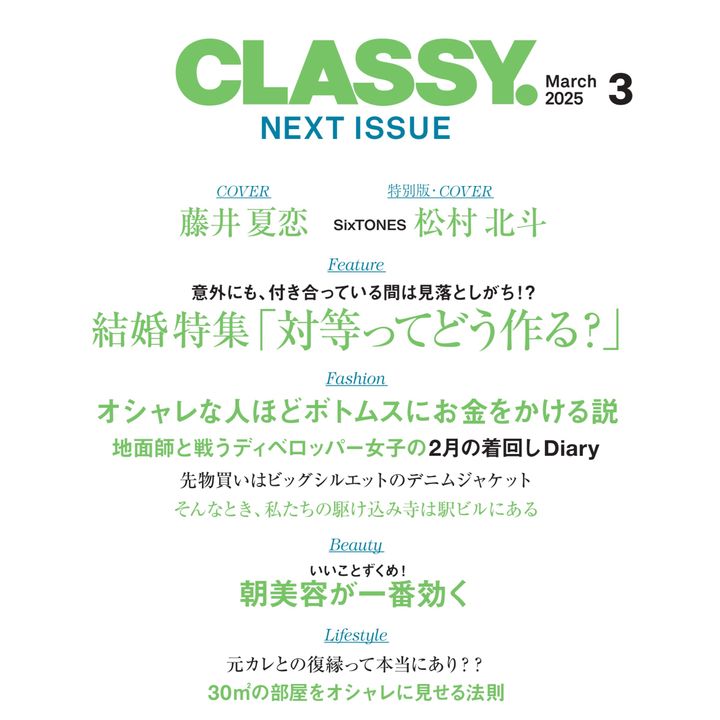 CLASSY.初の男性表紙として話題を呼んだSixTONES松村北斗さんが、1年ぶりに表紙に戻ってきます! 2025年3月号の特別版で、カバーに登場。1月28日(火)発売の3月号、本日より予約開始しているので、ぜひチェックしてください。