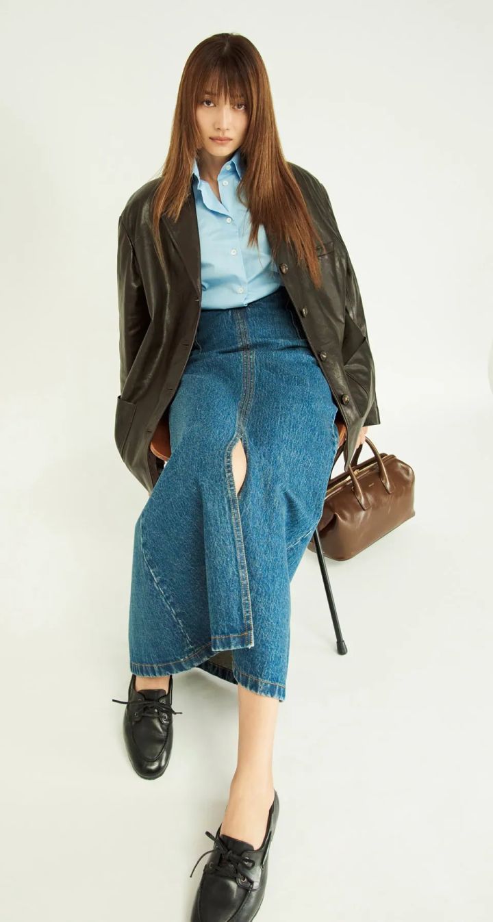 第2位 上質なバリーのレザージャケットを デニムスカートで気負わずサラリと