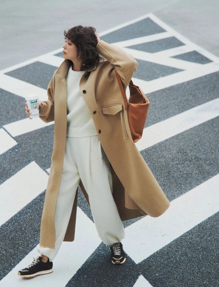 堂々の第1位は、ウールコートが主役のカジュアルスタイル。やっぱり冬アウターの王道、オンにもオフにも使えるのは上質なウールのロングコート。リラクシーなオールホワイトのニット上下に品のあるキャメルカラーのコートがマッチ。足元はスニーカーでラフなヌケ感を作るのがこなれ感アップのポイントです。リアルスタイルとして真似しやすいシンプルコーデにラブコールが集まる結果に。これぞミューズな大人カジュアル!