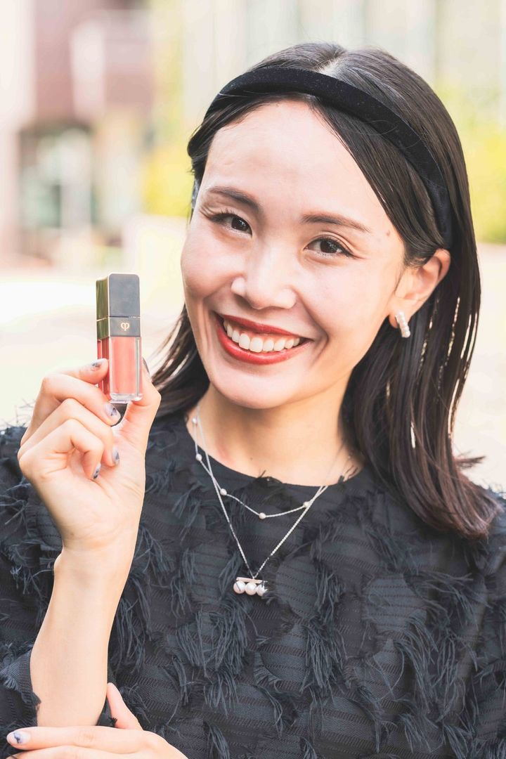 「クレ・ド・ポー ボーテのルージュクレーム ブリアンの205番は艶とマットのバランスが絶妙。軽い付け心地なのに保湿力も高く、マスクをしても塗り直しが必要ないので、口紅をしっかり塗りたい派の私にぴったりで重宝しています」佐藤 彩さん・34歳(157センチ/5歳の女の子と3歳の男の子ママ)