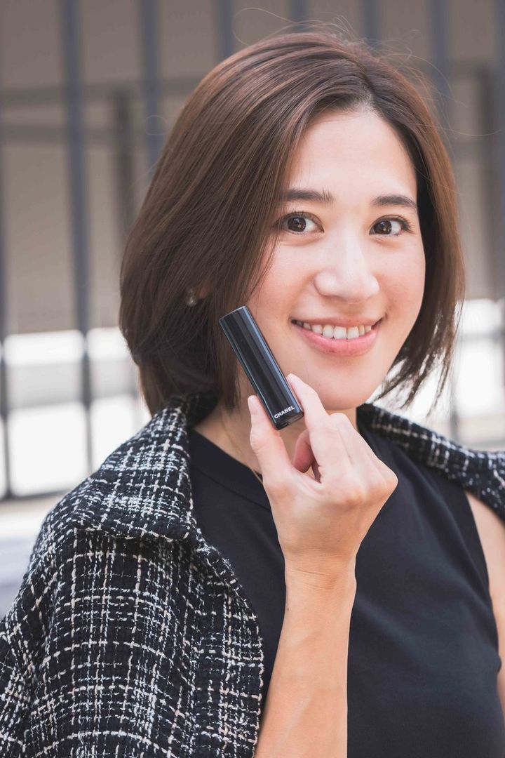 「シャネルのルージュ アリュール ヴェルヴェット62番は自然な色味なので、落ち着いた印象に見せたい園行事や送迎にぴったり。保湿力も高く、一度塗ると長時間持つところも嬉しいポイントです」苅谷純子さん35歳(158センチ/4歳の男の子と2歳の女の子ママ)