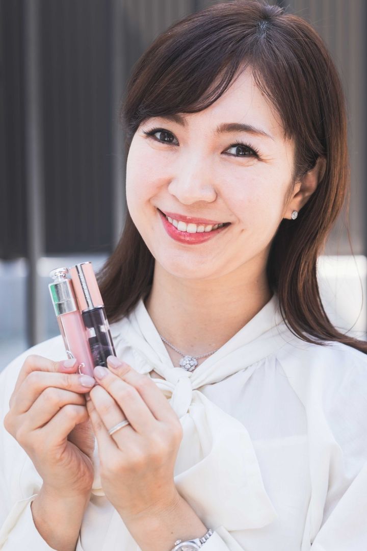 「10年近く愛用しているディオールのアディクト リップ マキシマイザー1番と、ジバンシィのローズ・パーフェクト・リキッドの11番を重ね付けしています。ディオールは乾燥しているときに塗ると唇がぷっくりと生き返り、ほぼ無色なのでリップクリーム代わりにも。ジバンシィは友人からの贈り物ですが、ph値で色が変わり、肌なじみのいいカラーになるのでヘビロテしています」大塚麻依子さん・35歳(160㎝/9歳と5歳の男の子と2歳の女の子ママ)