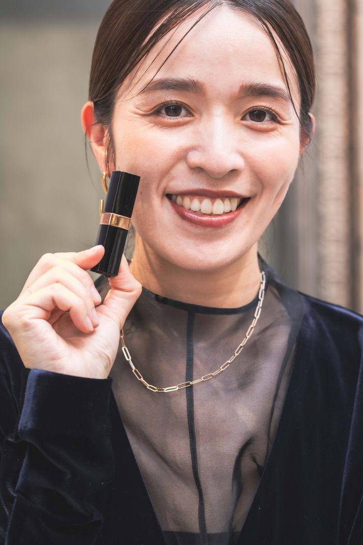 「シャネルのルージュ ココ フラッシュ172番を使っています。ブラウンレッドで秋冬コーデに馴染みやすく、これ一本でぐっとおしゃれ顔になるのでおすすめです。ブラウンリップは強めな印象になりがちですが、これは透け感もあり優しげに見えるのでさらりと一度塗りして園行事にも」佐々木千紘さん・35歳(157センチ/6歳の男の子と4歳の女の子ママ)