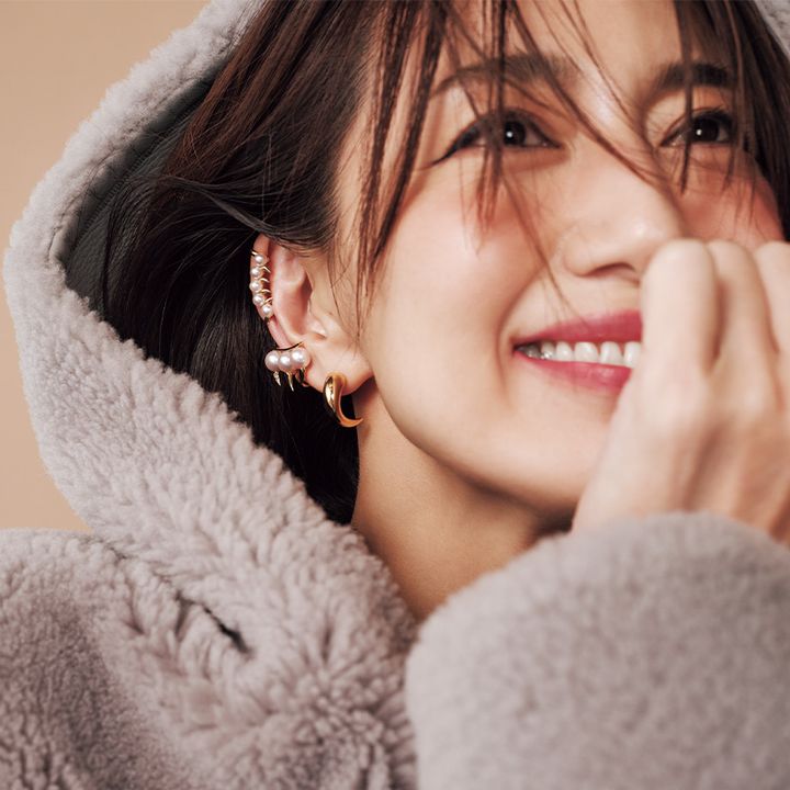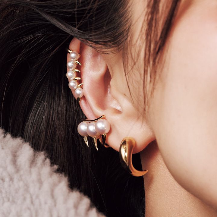 「デインジャー」[上]イヤーカフ[K18YG×あこや真珠]¥427,900[中央]イヤリング※片耳用[K18YG×あこや真珠×DIA]¥357,500[下]イヤリング[K18YG×あこや真珠]¥421,300(すべてTASAKI)ジャケット¥363,000(ギャルリー・ヴィー/ギャルリー・ヴィー丸の内店)