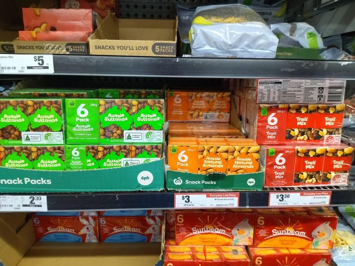 バラまき土産として大好評だったのが「Trail Mix(トレイルミックス)」AU$3.30(6個入り)。ドライフルーツとミックスナッツが入った商品で、1パッケージにキャラメルボックス6個入りでAU$3.30という安さ! そのほかにもアーモンドや干しブドウの種類があります。