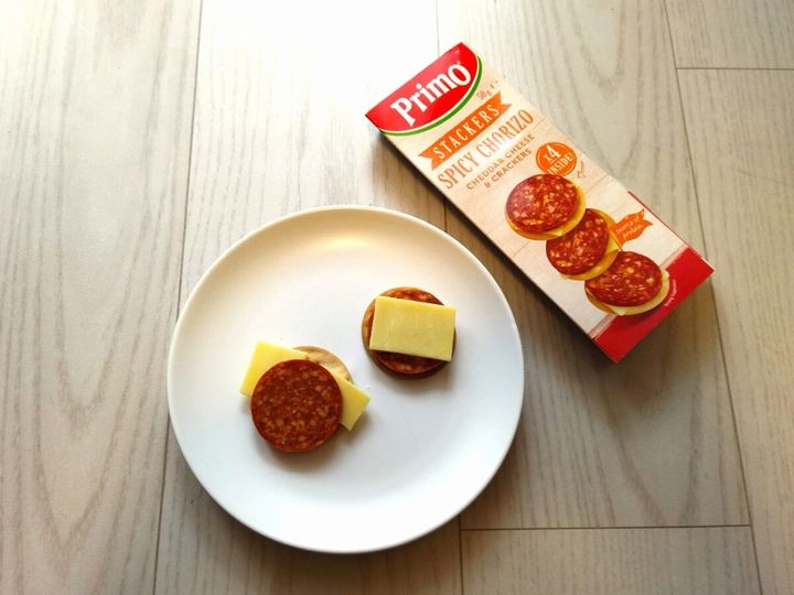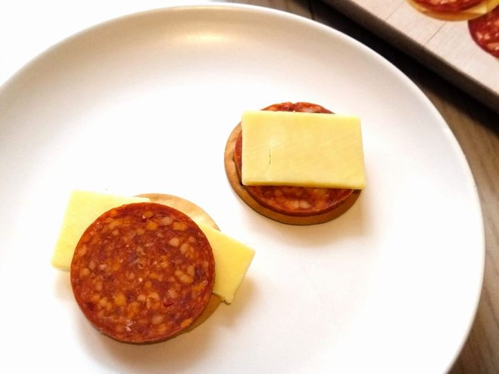 チェダーチーズ・クラッカー・サラミが各4枚ずつ入り、スライスされているので重ね合わせたら出来上がり!