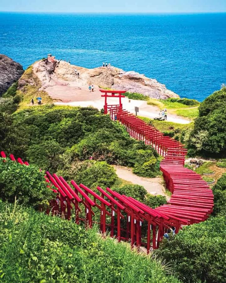 赤い鳥居、真っ青の日本海、緑の大地のコントラストは圧巻。
